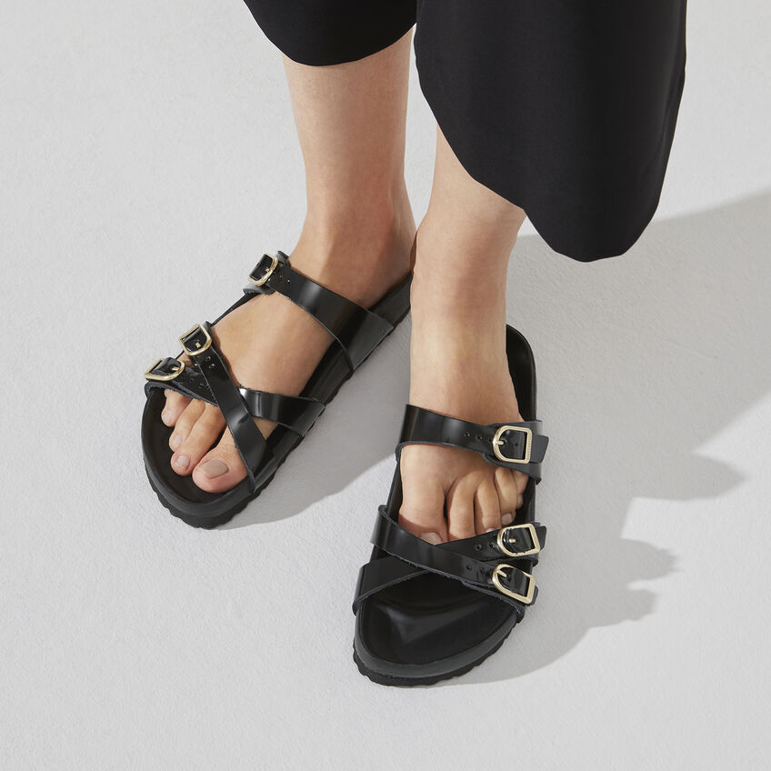 A BIRKENSTOCK Franca egy lendületesen kialakított papucs keskeny, keresztezett pántokkal. A formatervezés és kényelem jól sikerült kombinációja a divatos nők elegáns és kényelmes társa a mindennapokban. A de luxe talpágy teljes egészében puha piumato bőrrel van bevonva, és gondoskodik a rendkívül kényelmes viseletről. A patkó alakú csatok különleges látványt garantálnak. A felsőrész kiváló minőségű, puha természetes bőrből készült lakkbevonattal.